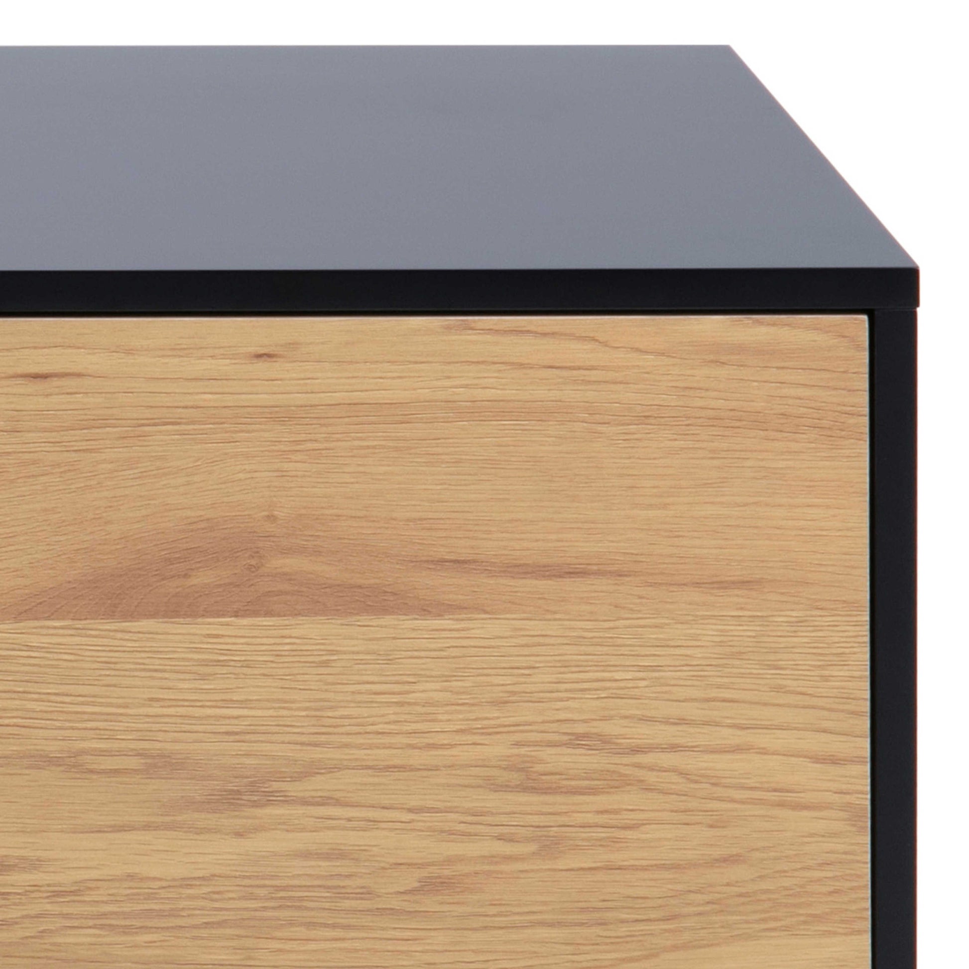 This TV Unit introduces a refined and contemporary presence to an entertainment space with its black painted top and frame paired with two doors and a drawer in a matte wild oak effect. The warm timber tone contrasts gently with the dark structure, creating a balanced modern look that works beautifully with organic décor, linen textiles, ceramics, faux plants and artificial greenery. The open compartment is ideal for media devices, while the overall layout keeps the room feeling calm and organised, blending naturally with Scandi inspired, rustic organic and minimalist interiors.