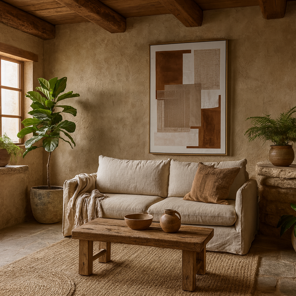 This abstract wall art brings together layers of earthy browns, warm neutrals, and textured grids that feel both raw and refined. The interplay of rough, painterly blocks with woven-inspired details adds dimension and tactile depth, creating a piece that feels grounded in craftsmanship. Its palette of clay, sand, and ivory tones calls back to natural landscapes, giving it an organic warmth that softens contemporary interiors.