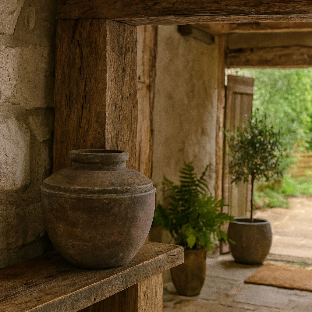 Perfect as a floor vase or statement planter, it works beautifully with dried grasses, branches, or lush greenery. A versatile accent for rustic, Japandi, and boho-inspired interiors, it adds depth, texture, and old-world soul to modern living spaces.