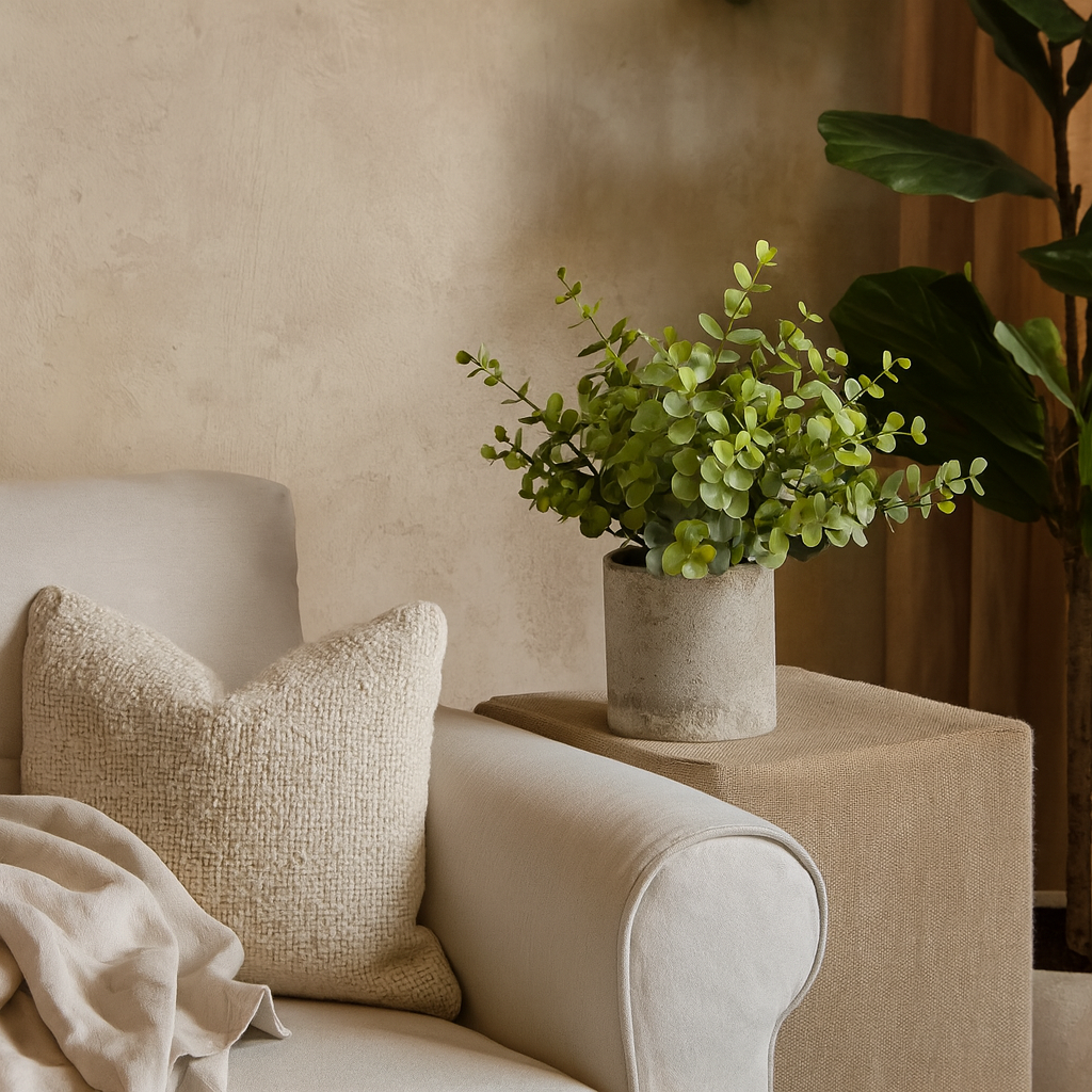 The concrete-effect pot adds raw, artisan appeal, making it a versatile accent for Japandi, boho, and rustic spaces. Whether layered with woven baskets and ceramics or placed solo as a statement of quiet greenery, this artificial plant offers timeless style that complements earthy tones, reclaimed wood, and linen textiles. A sustainable décor choice, it’s the perfect way to introduce texture and greenery into your home with zero maintenance.