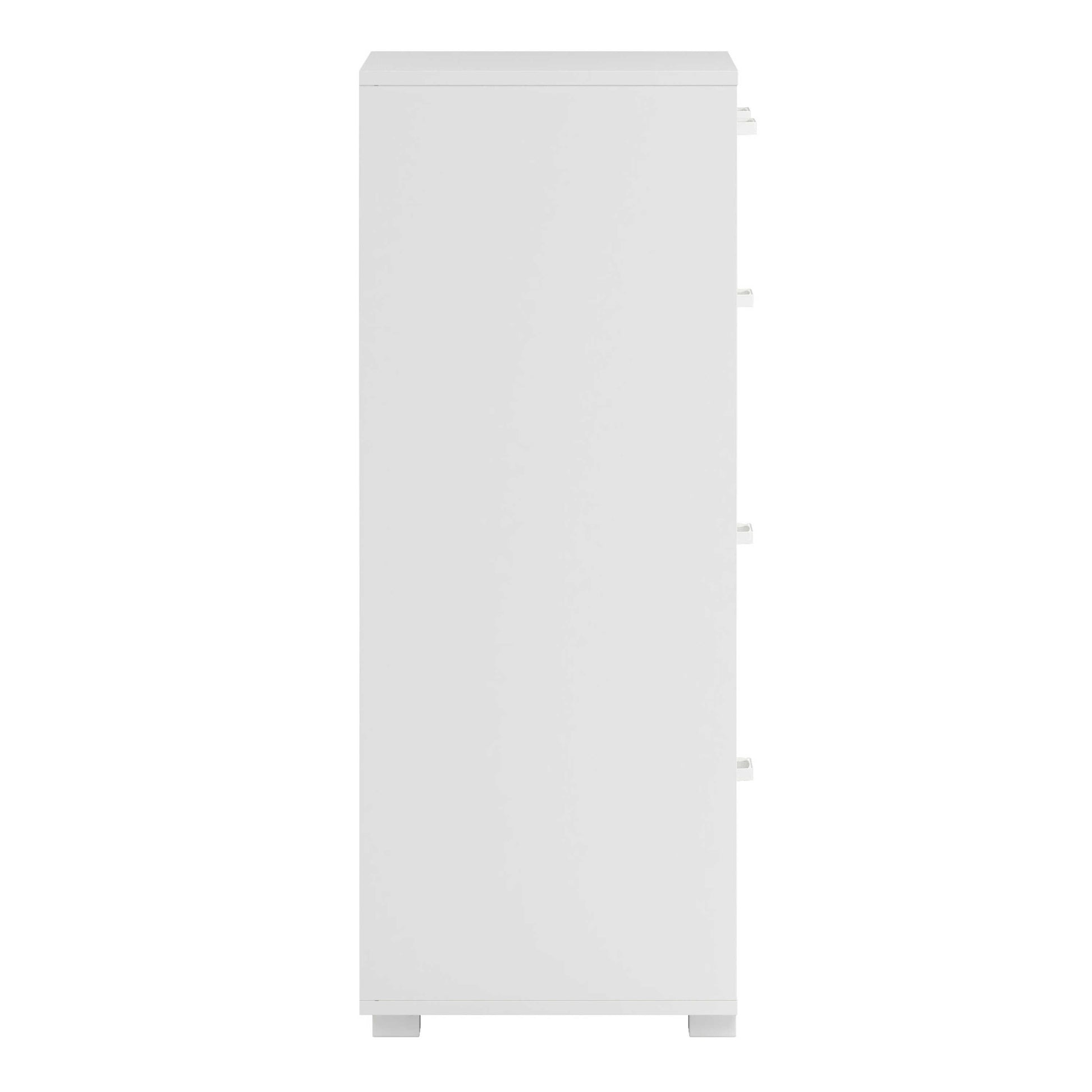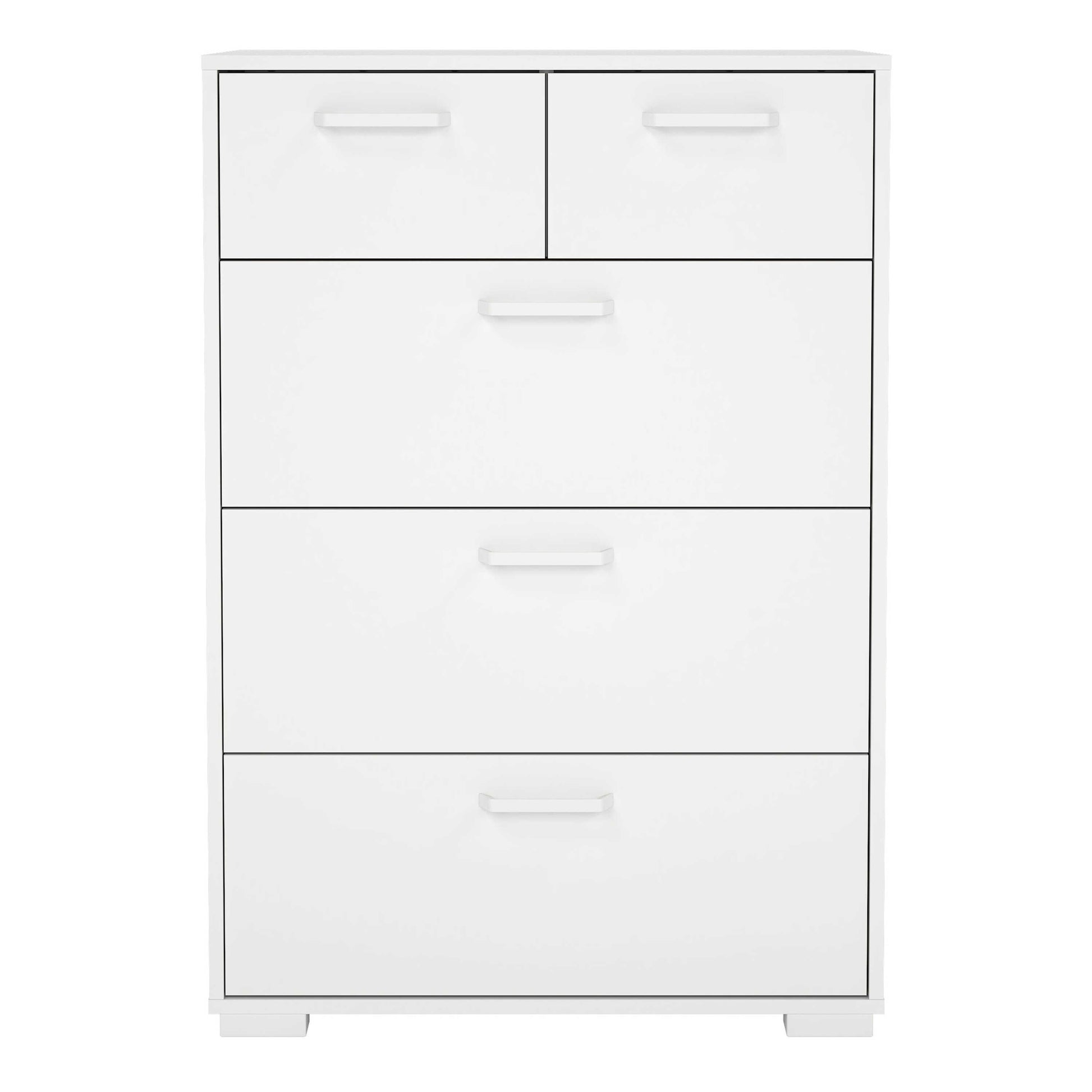 This chest of drawers brings a fresh modern calm into the bedroom, pairing a smooth gloss white finish with subtle metallic accents for a clean and uplifting aesthetic. Its compact silhouette features two smaller top drawers and three generously sized lower drawers, creating a versatile layout suited to clothing, accessories and everyday essentials. The reflective surface helps brighten the room, sitting beautifully against light walls and natural flooring for a soft Scandinavian inspired atmosphere.