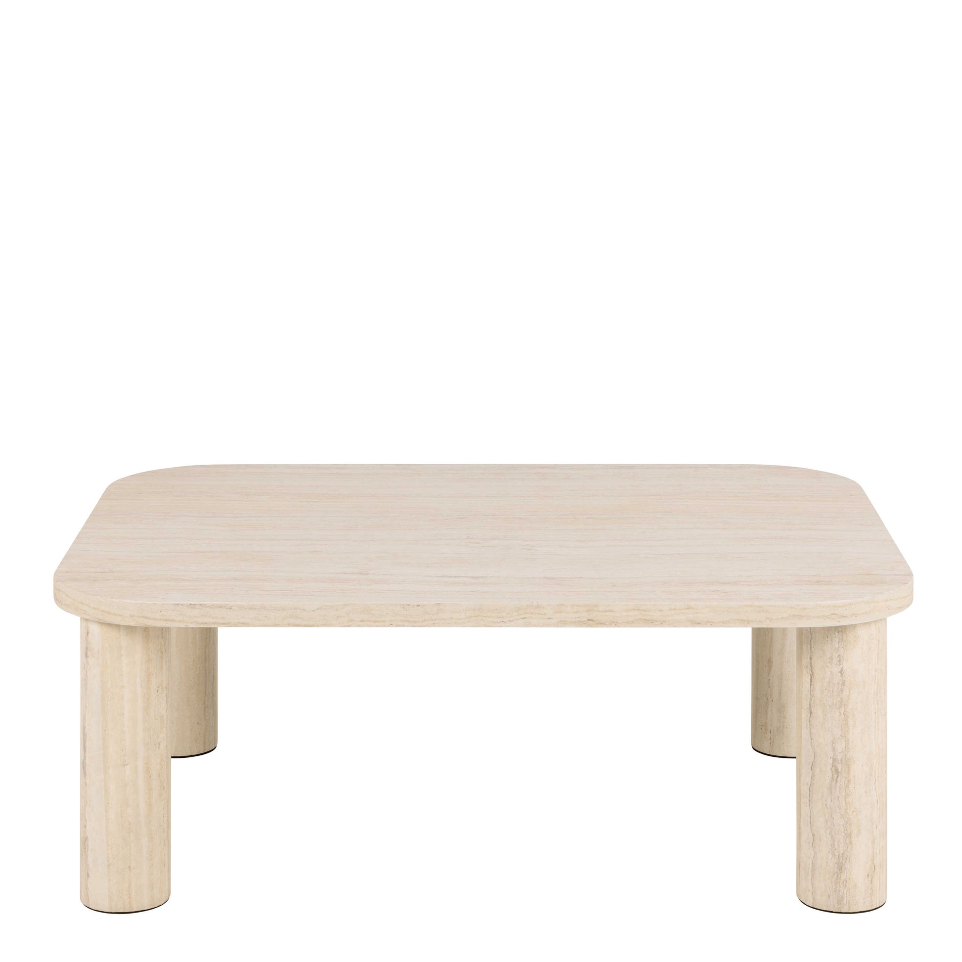 This coffee table brings a warm modern organic character to the living room, combining a travertine inspired finish with a soft rectangular form that suits calm, light toned interiors. The tabletop has gently rounded corners, offering a refined silhouette that balances structure with a welcoming feel. Its textured surface captures the look of natural stone while keeping the design practical and lightweight, giving the room a subtle yet sophisticated focal point.
