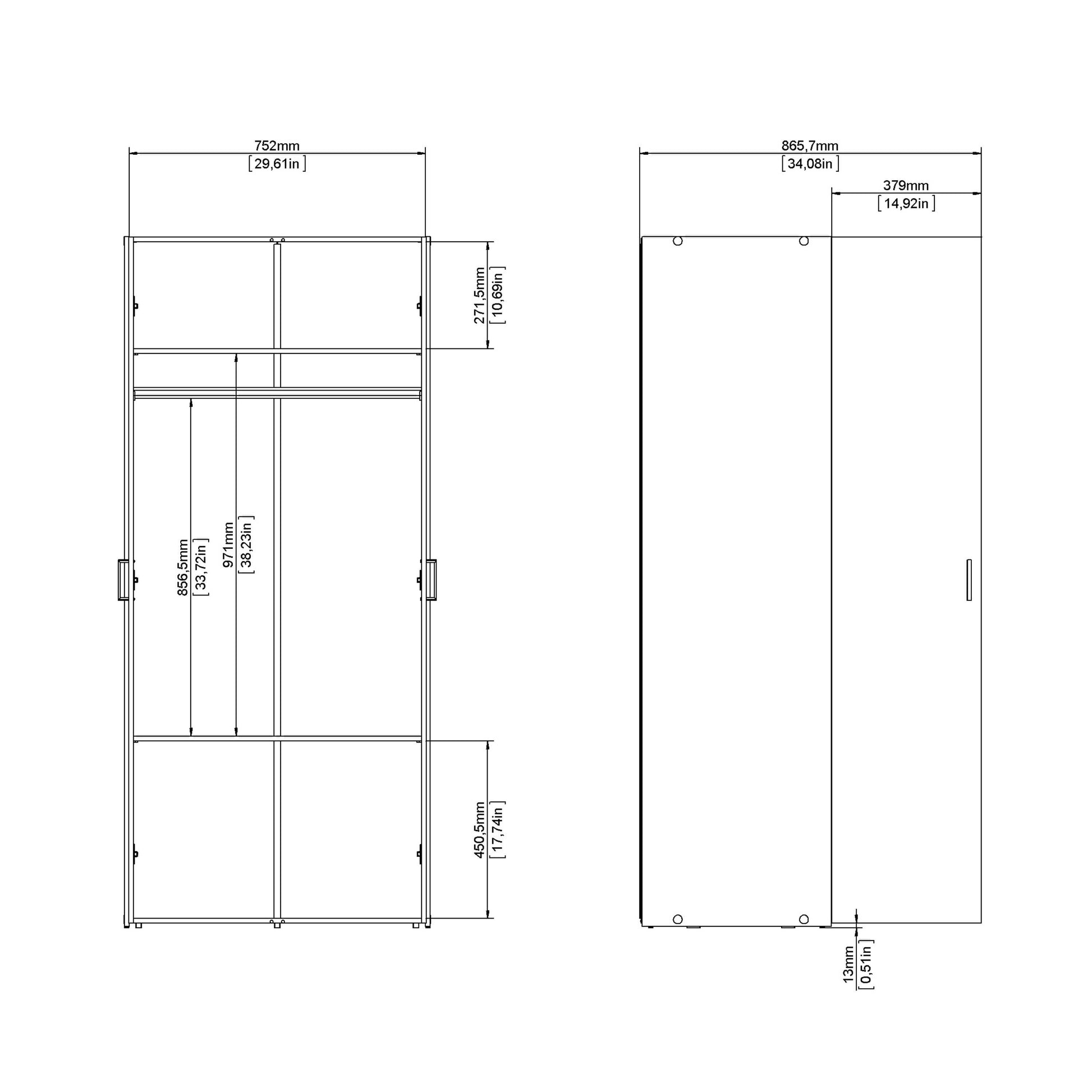 Inside, a practical arrangement keeps daily essentials neatly organised. A sturdy hanging rail accommodates clothing and outerwear, while an overhead shelf and additional lower shelving provide space for folded items, shoes and storage boxes. Thoughtfully designed for effortless organisation, this wardrobe offers a functional balance of style and practicality, bringing order and quiet sophistication to any modern home.