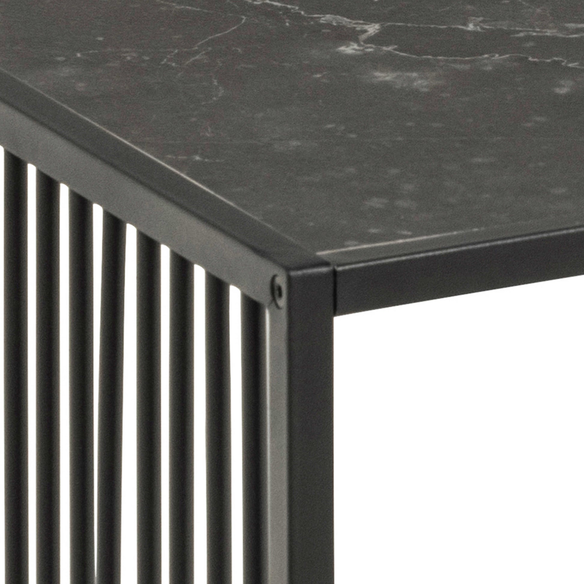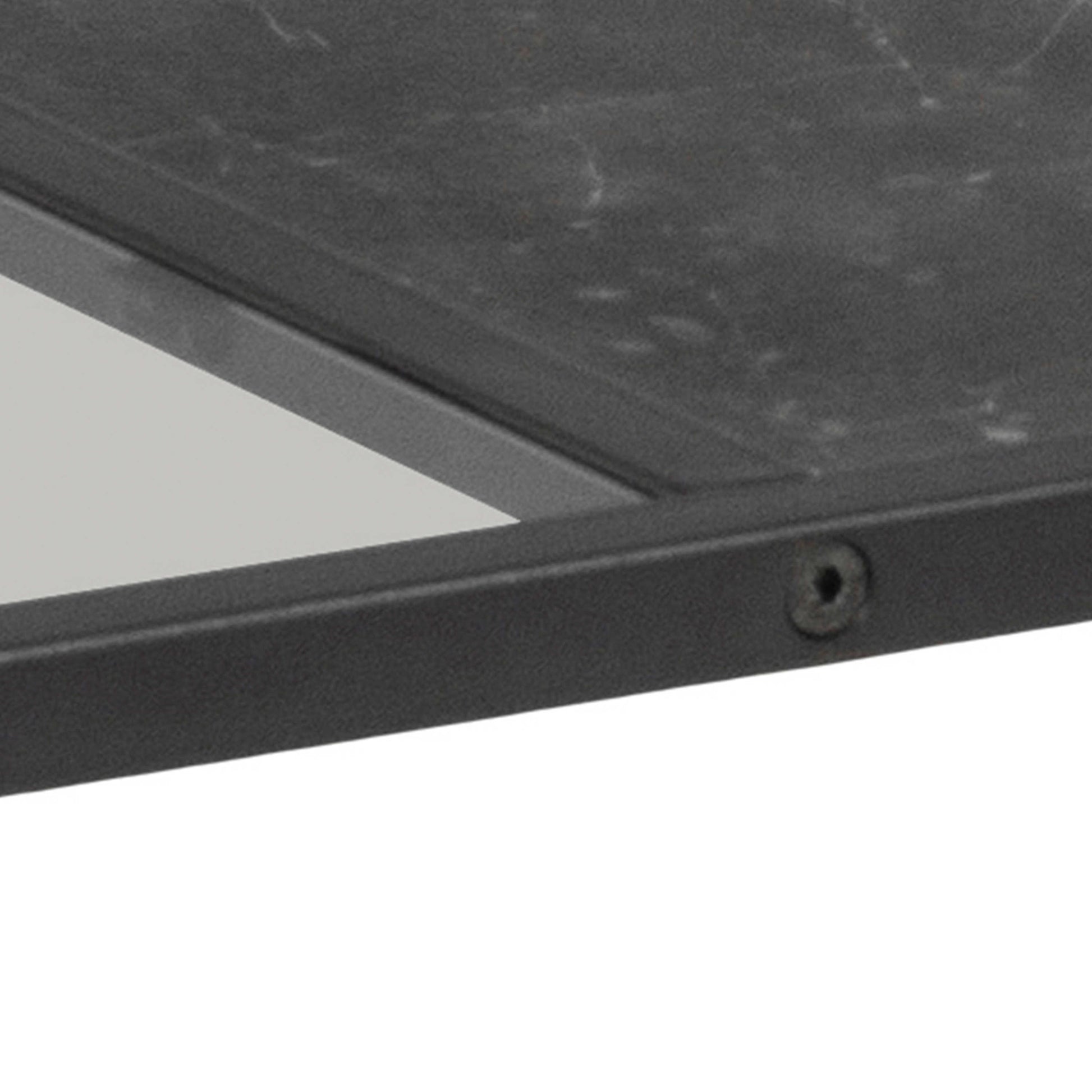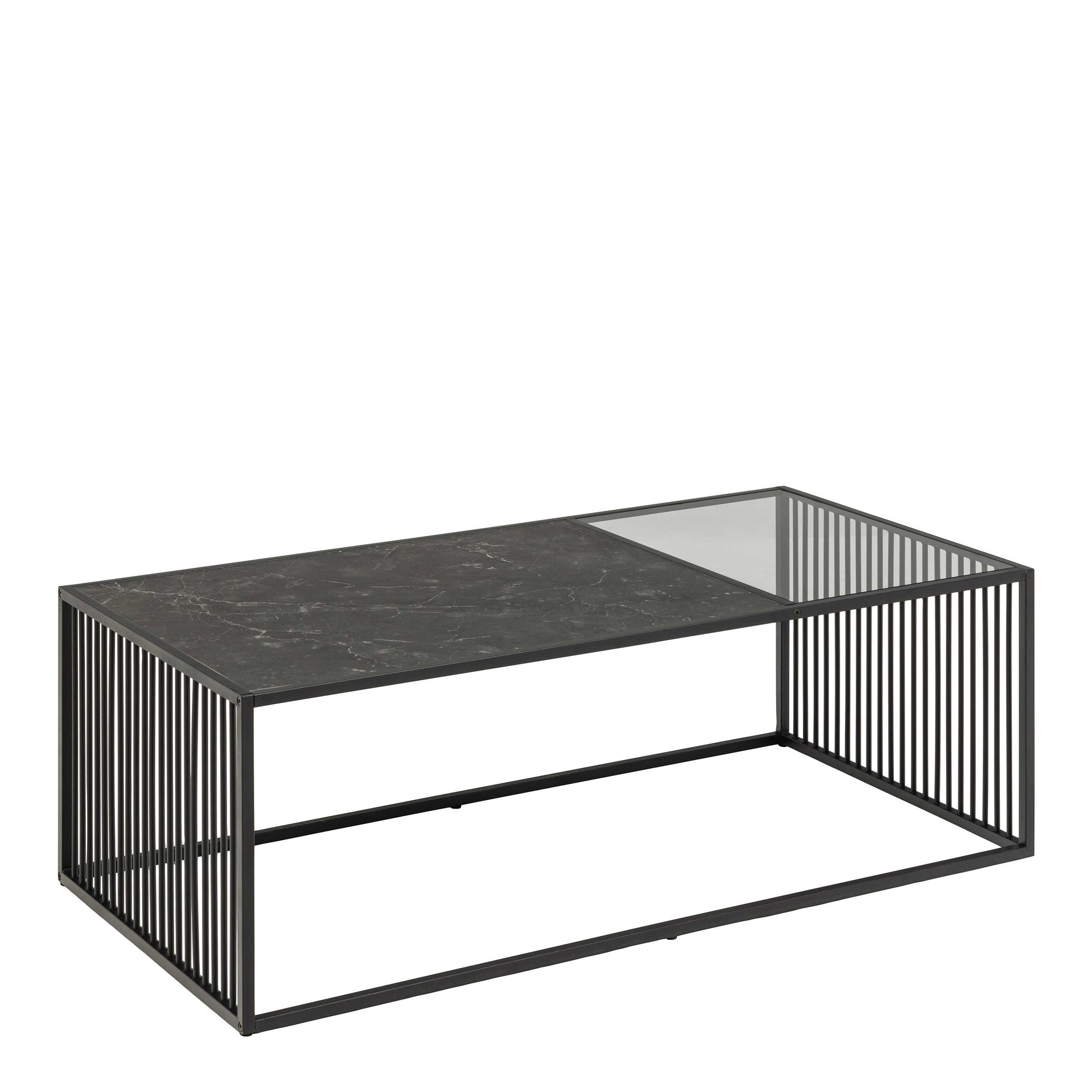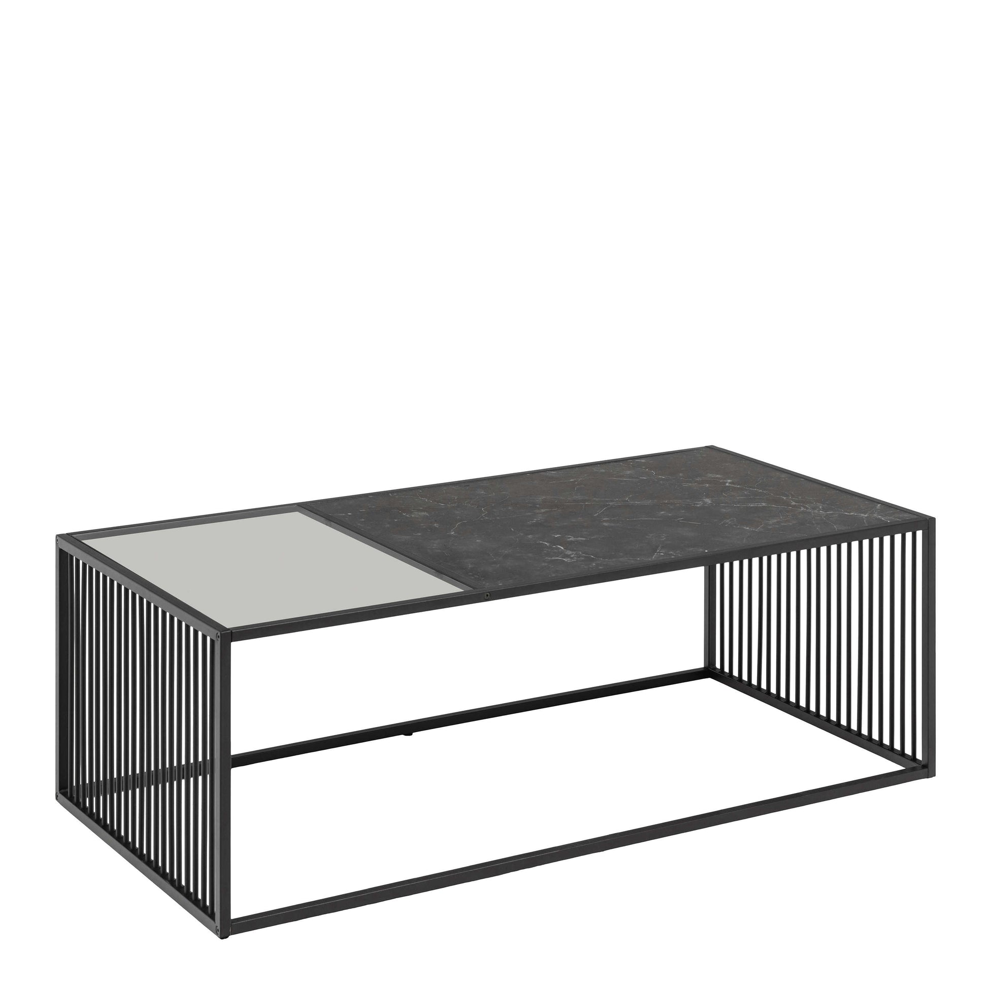 This coffee table brings a calm modern organic presence into the room with its long, refined silhouette and mixed surface design. The combination of a moody stone effect top and a clear glass panel creates a beautifully balanced contrast, giving the table both weight and lightness. Its slim black metal frame keeps the look open and architectural, allowing the surrounding space to breathe while adding a strong, crafted character to the room.