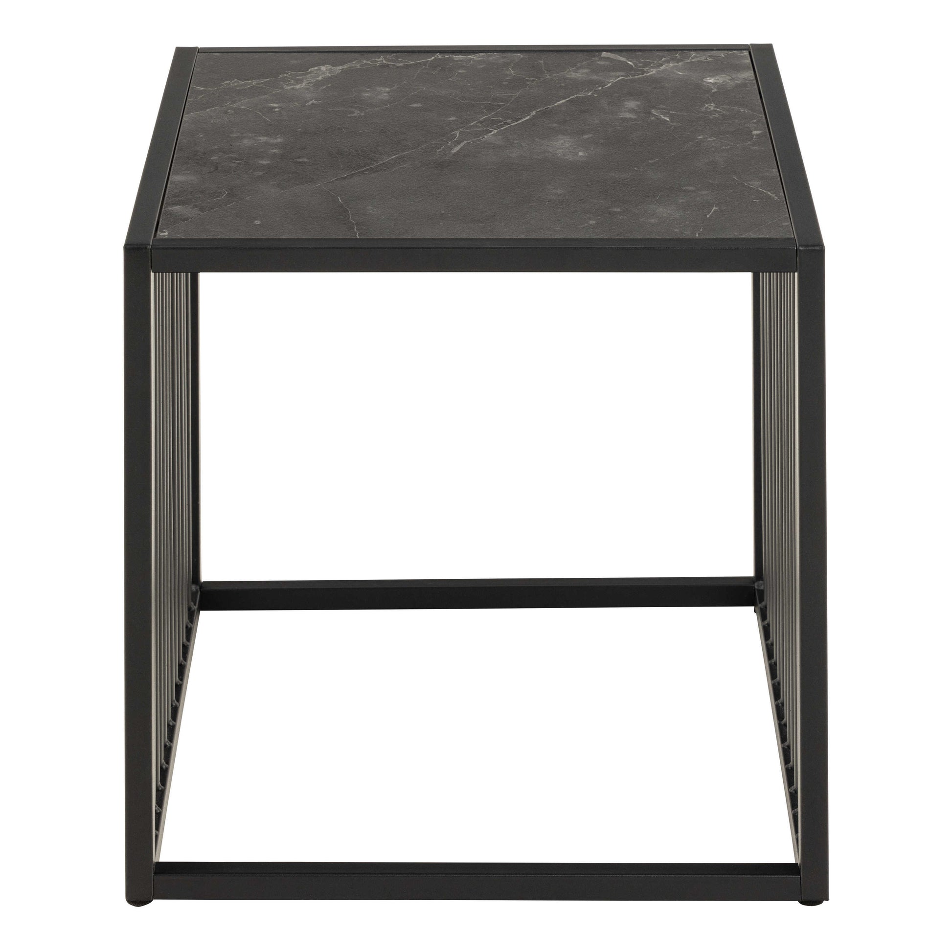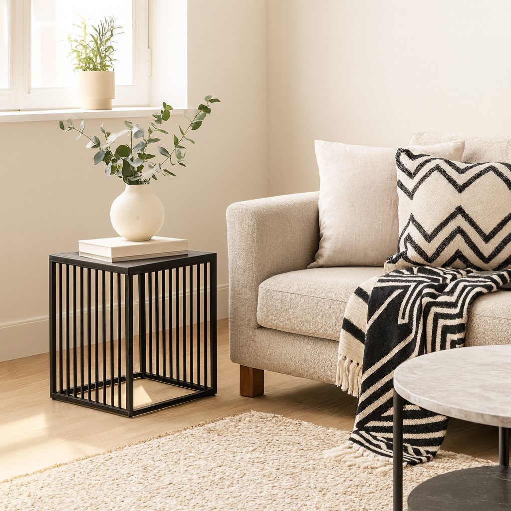 This side table brings a grounded modern energy into the room with its matte black stone look top and airy wire frame that feels both sculptural and understated. The square shape keeps the silhouette clean and purposeful, giving the space a touch of curated minimalism without losing warmth. Its textured surface and open structure make it effortless to style with faux plants, artisan ceramics or a favourite book, blending seamlessly into contemporary, Japandi inspired and modern organic interiors.