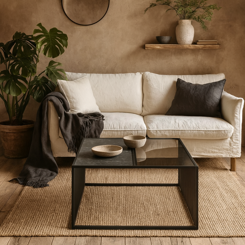 This coffee table brings a modern organic spirit into the living space, blending cool black metal lines with a moody stone look and a clear glass panel that feels both crafted and contemporary. The contrast of the minimalist frame with the natural stone effect creates a centrepiece that feels right at home in city lofts, modern rustic homes and spaces inspired by slow living. Its square form, open base and airy silhouette keep the room feeling light while still adding presence, grounding the interior with quiet confidence.