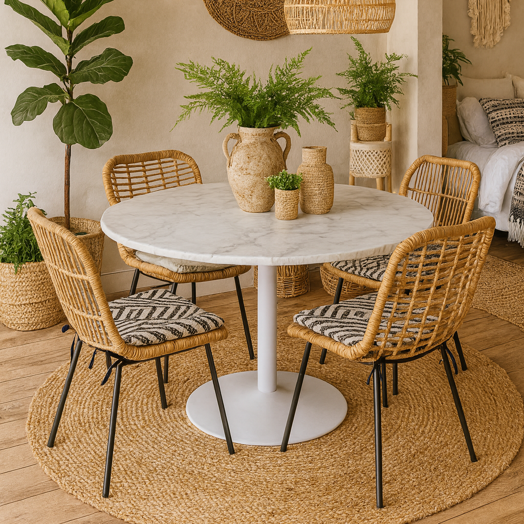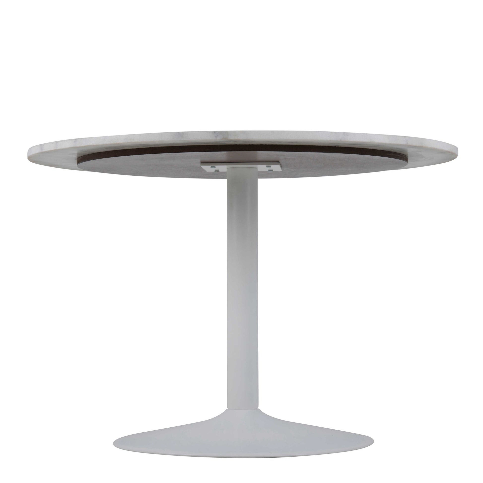 This dining table brings a calm sense of modern luxury into the dining space, pairing a polished white marble top with a smooth white steel base that feels sculptural and understated. The round silhouette softens the room, creating a relaxed flow that encourages easy conversation and a more intimate dining experience. Its clean lines and elegant finish make it a standout choice for contemporary homes that appreciate refined simplicity and natural texture.