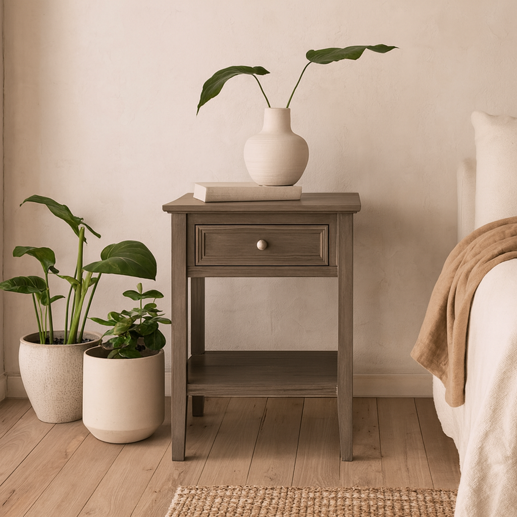 This grey wooden bedside table combines rustic farmhouse character with everyday practicality. Finished in a soft washed grey that highlights the natural grain, it features a single drawer with a simple metal knob and a lower shelf for added storage or display. The clean lines and solid construction give it a timeless look that suits both modern and traditional interiors.