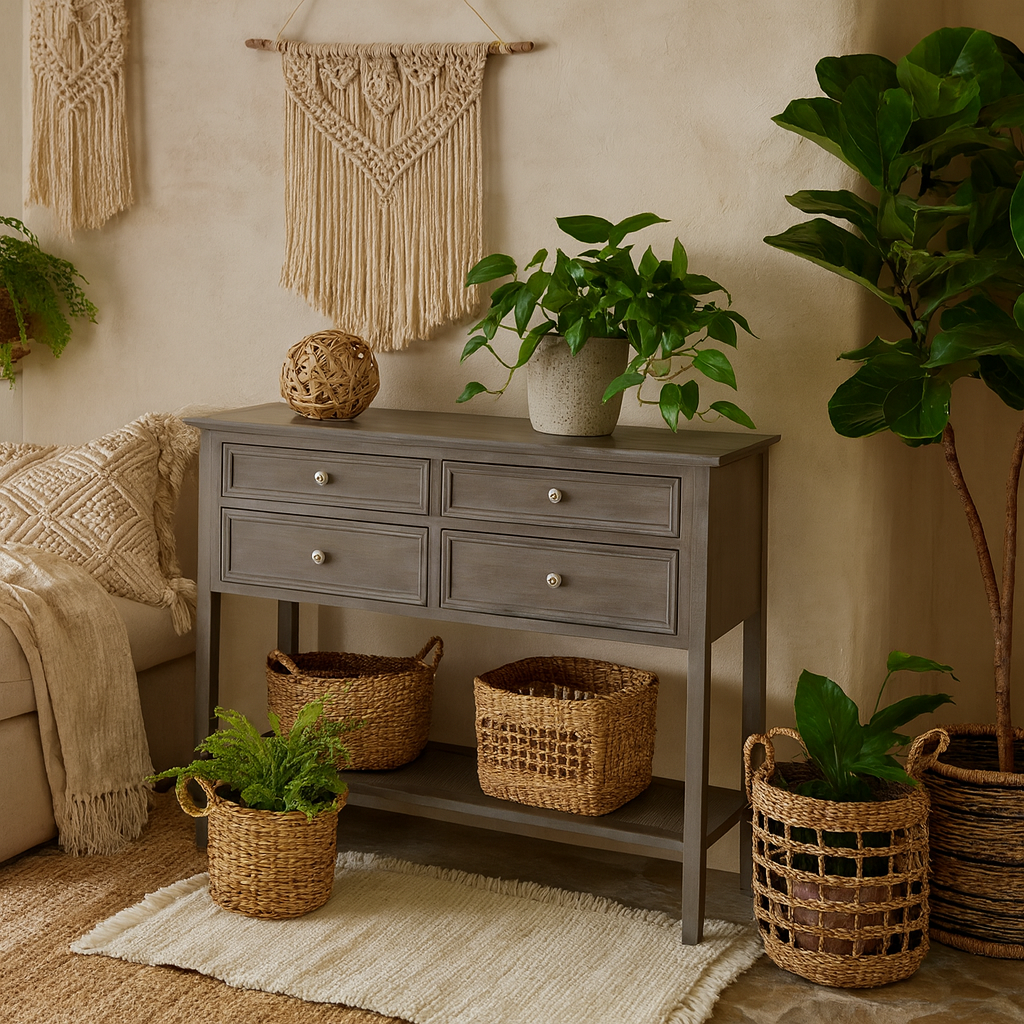 This console table brings a balance of form and function with its clean lines and subtle grey wash finish. Four drawers with simple metal knobs provide handy storage for keys, stationery, or other daily essentials, while the open lower shelf is perfect for baskets, books, or a touch of greenery. Its slim, elevated frame keeps the look light and versatile, fitting easily into hallways, living rooms, or even bedrooms.