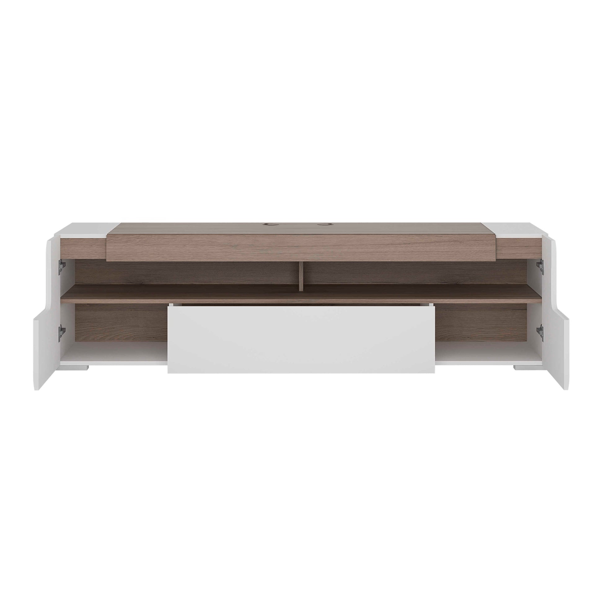 Behind the smooth exterior, soft close doors and easy glide drawers provide generous hidden storage, perfect for keeping chargers, remotes and everyday items tucked away. The durable laminated board ensures long lasting resilience, even in busy homes, while the thoughtful layout keeps multimedia gear organised and accessible. This design is a sophisticated anchor for any modern living space, combining practical function with a calm, elevated aesthetic.