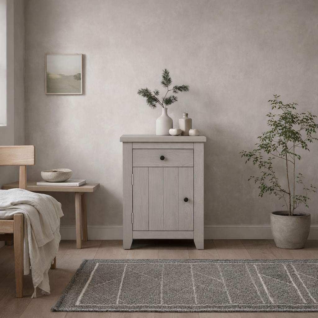 Designed as a bedside cabinet, it offers practical storage without visual weight. Solid wood construction adds reassurance for everyday use, while the gentle grey tone works across changing styles. It creates a relaxed and functional bedside setting, offering useful space alongside a quietly timeless presence that feels considered, familiar, and effortlessly easy to live with.