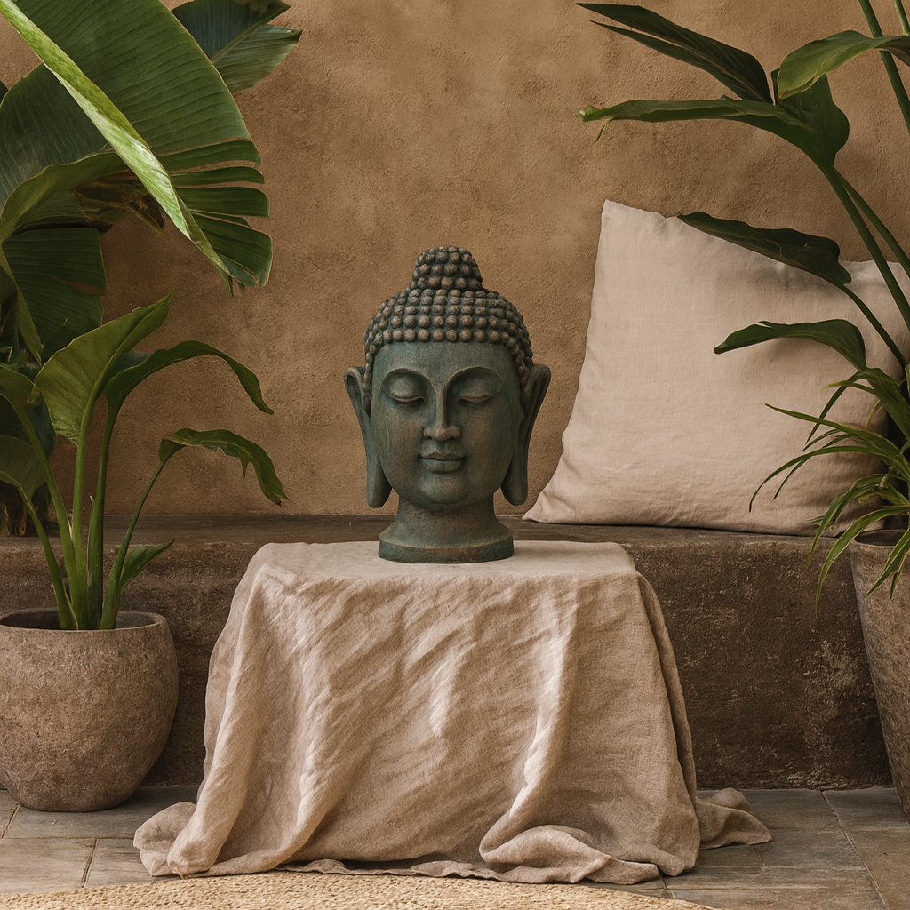 Perfect for gardens, courtyards, or meditation spaces, its serene expression and textured detail evoke balance and mindfulness. Whether placed amongst lush greenery, beside a water feature, or styled as a focal point on a terrace, this piece offers a soulful accent that blends seamlessly with rustic, wabi-sabi, or modern outdoor aesthetics.