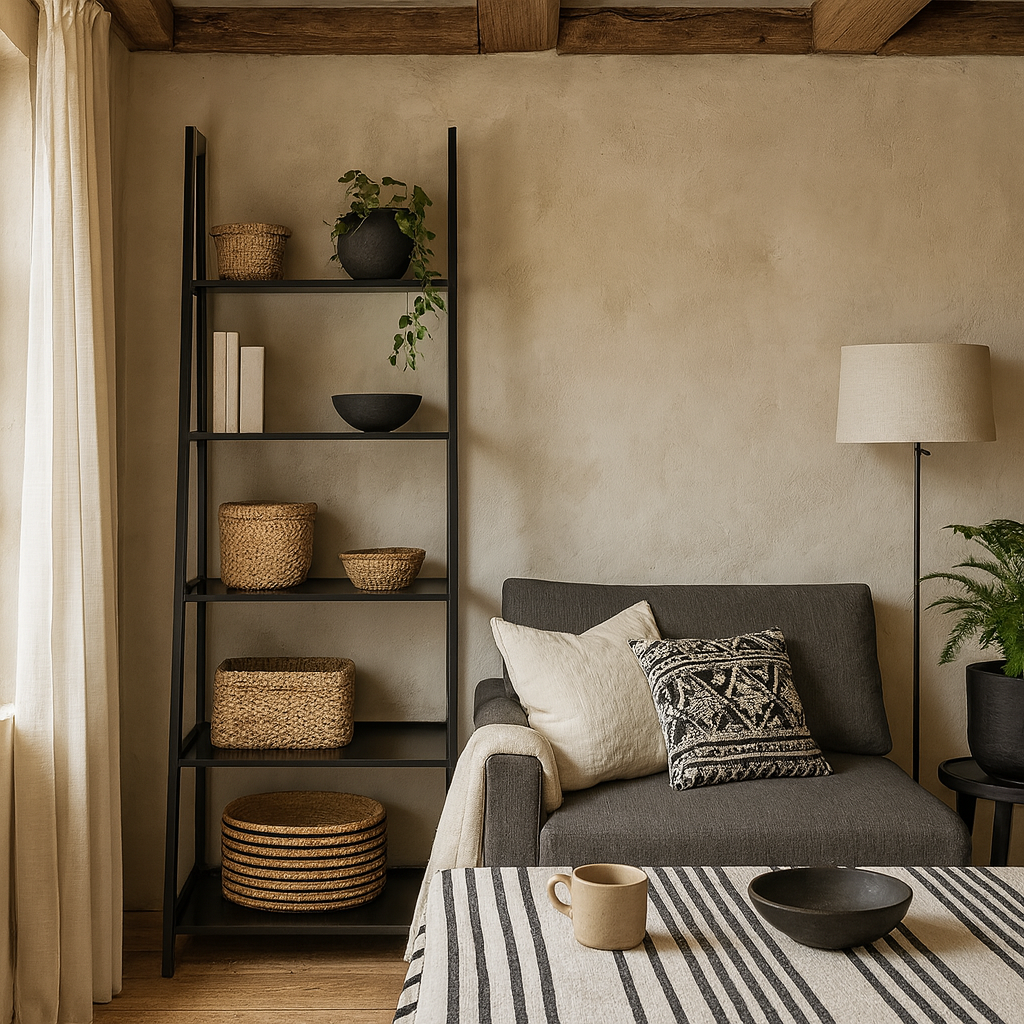 This ladder style bookcase brings a bold, contemporary edge to living rooms, home offices and creative display areas. The black painted MDF frame creates a strong architectural outline, while the five staggered shelves add rhythm and dimension, making it ideal for showcasing books, plants or curated décor. Its sleek, upright form offers ample vertical storage without overwhelming the room.