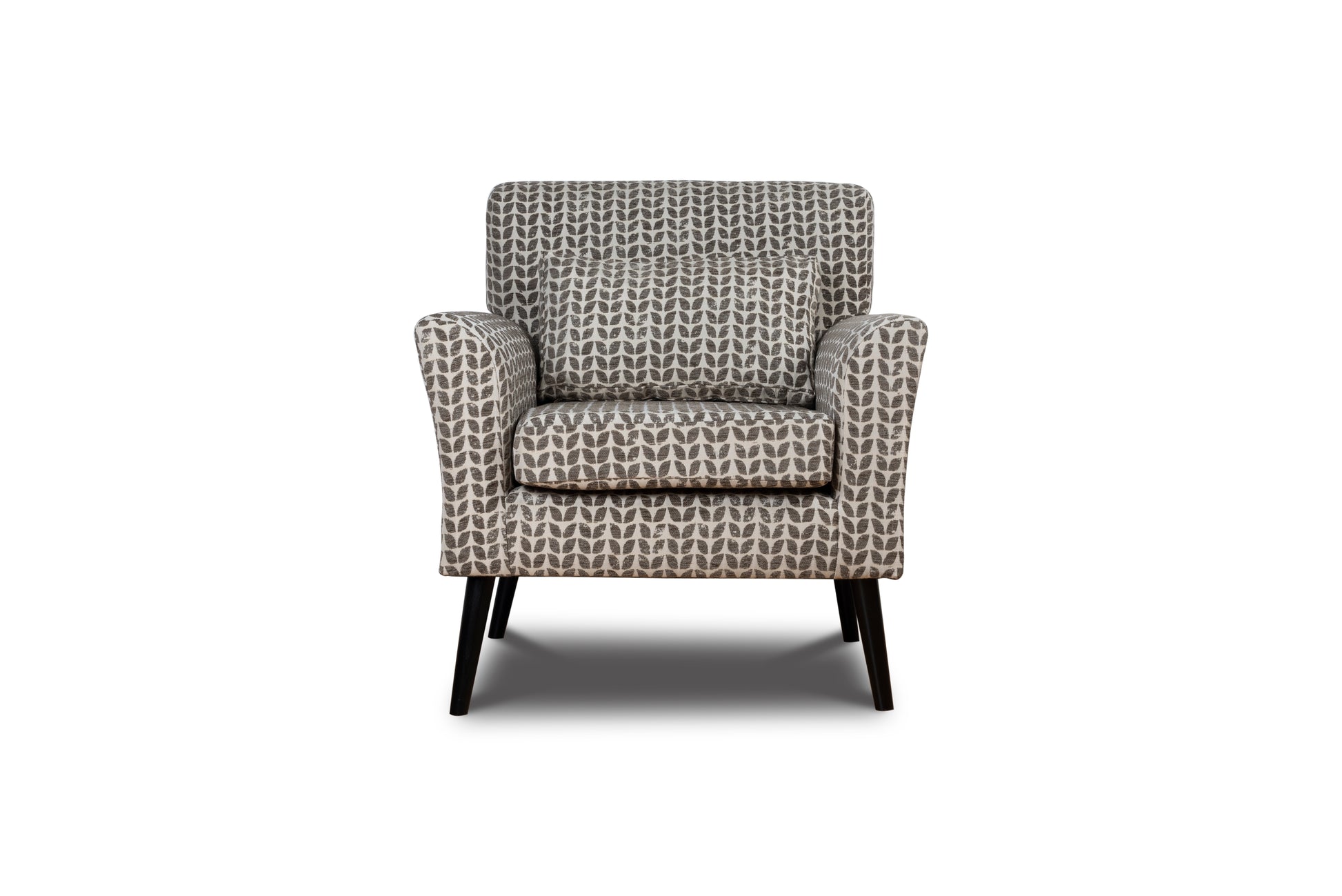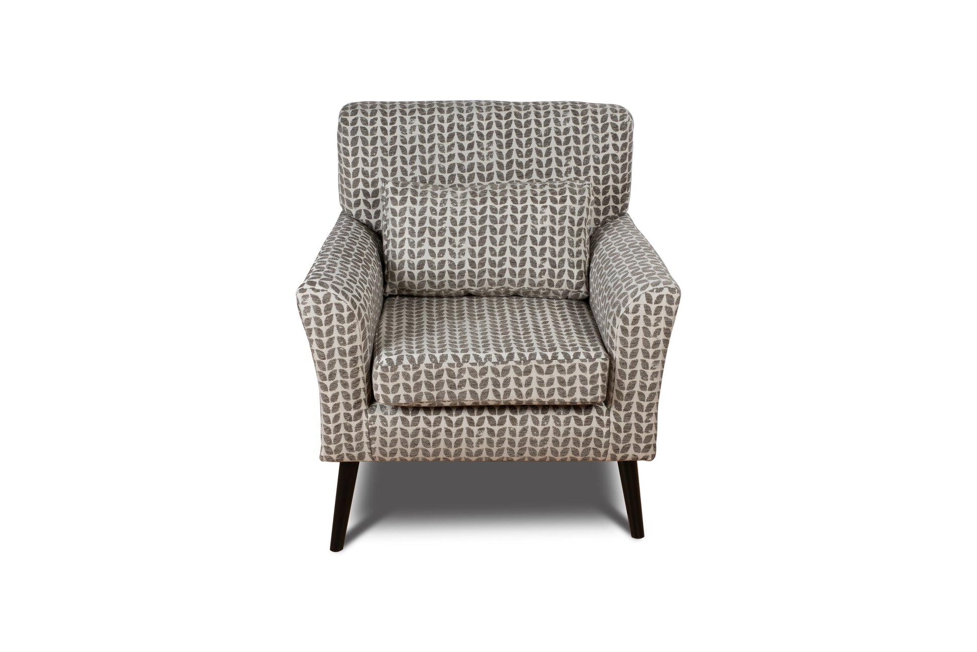 Designed for those who love effortless style with a hint of retro charm, this piece brings texture and warmth to any room. The grey patterned upholstery adds visual interest without overwhelming the space, while the softly flared arms and tapered legs give it that timeless mid-century silhouette. Plush cushioning and a matching lumbar pillow make it as comfortable as it is characterful.