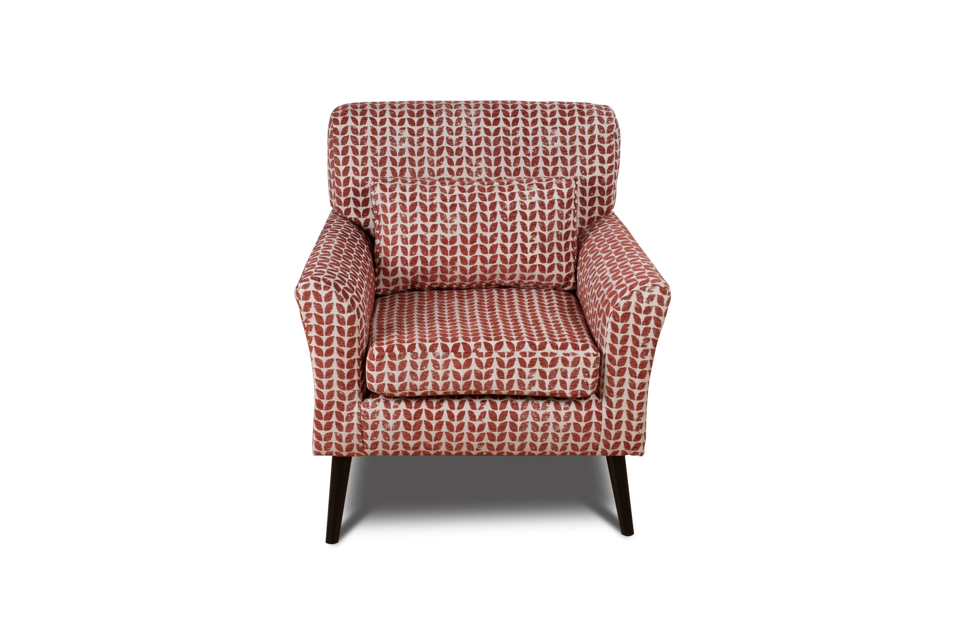 Bursting with personality and mid-century charm, this piece brings a touch of artisan flair to any corner of the home. The terracotta patterned upholstery adds warmth and texture, while its gently flared arms and tapered legs nod to classic retro design. Plush cushioning and a matching lumbar pillow make it as comfortable as it is stylish — a perfect balance of form and function.