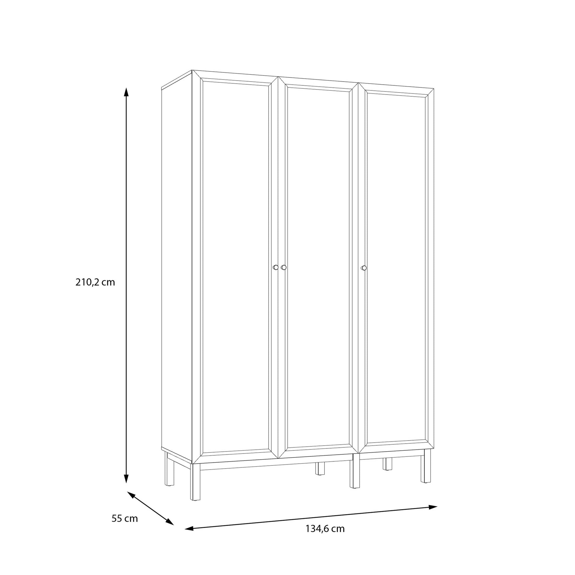 This three door wardrobe combines a calm light grey finish with oak legs, creating a balanced and refined presence in the bedroom. Six medium shelves, a wide drawer and a full length hanging rail provide thoughtful organisation for clothing, accessories and seasonal items. The soft closing doors add a quiet sense of luxury, keeping movement smooth and reducing wear through daily use. Wooden knob handles introduce a subtle natural touch that complements the overall look.