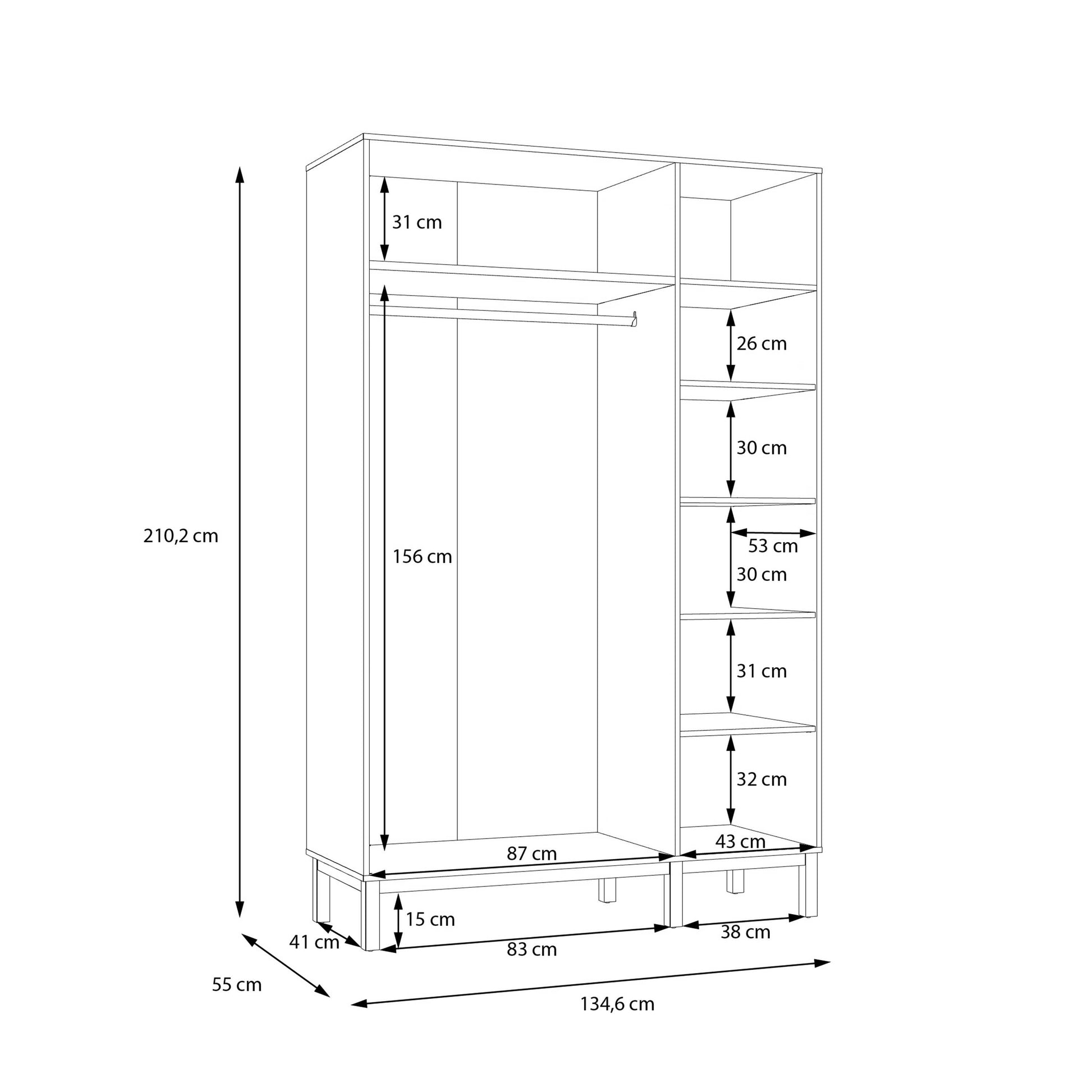 Behind the twin doors sits a generous hanging area for coats, dresses and longer garments, while the side section houses shelving suited to folded pieces and storage boxes. The wide upper drawer further enhances practicality, offering a tidy space for smaller items. Designed to keep the room organised and visually light, this wardrobe blends structure, warmth and dependable functionality in a well proportioned form.