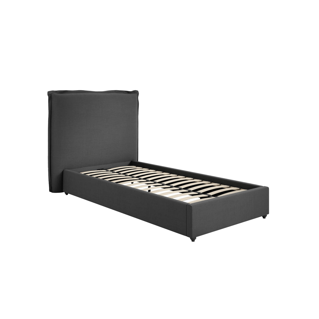 This single bed is upholstered in deep grey linen fabric, bringing a strong yet versatile tone to compact spaces. The pillow headboard is softly padded, offering comfort for sitting while adding shape and definition to the frame.