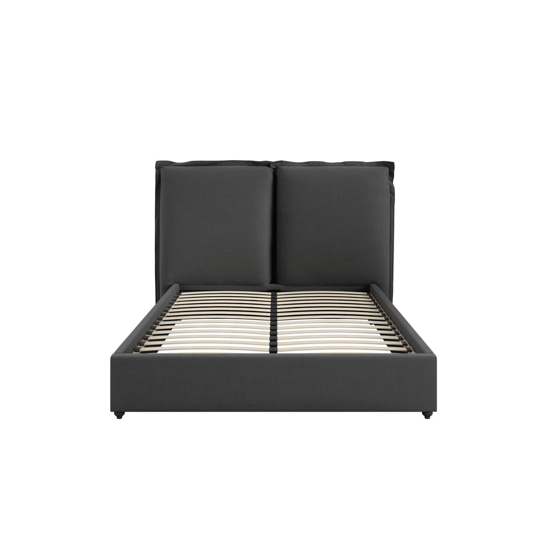 Finished in deep grey linen fabric, this double bed introduces warmth and texture through its woven upholstery. The padded pillow headboard offers a comfortable surface to lean against, adding softness while maintaining a neat, structured outline.