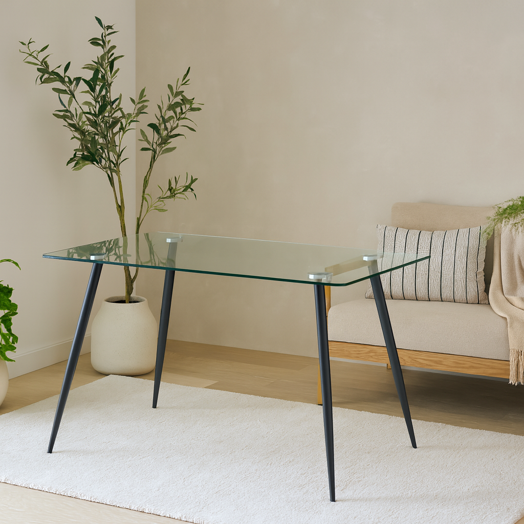 This dining table pairs a clear tempered glass top with a matte black powder coated steel base, creating a light and modern focal point for any dining space. The transparent surface opens up the room visually, giving the table an airy elegance that works beautifully in both compact and open plan interiors. Slim, angled legs add a refined architectural touch while keeping the silhouette uncluttered and balanced.