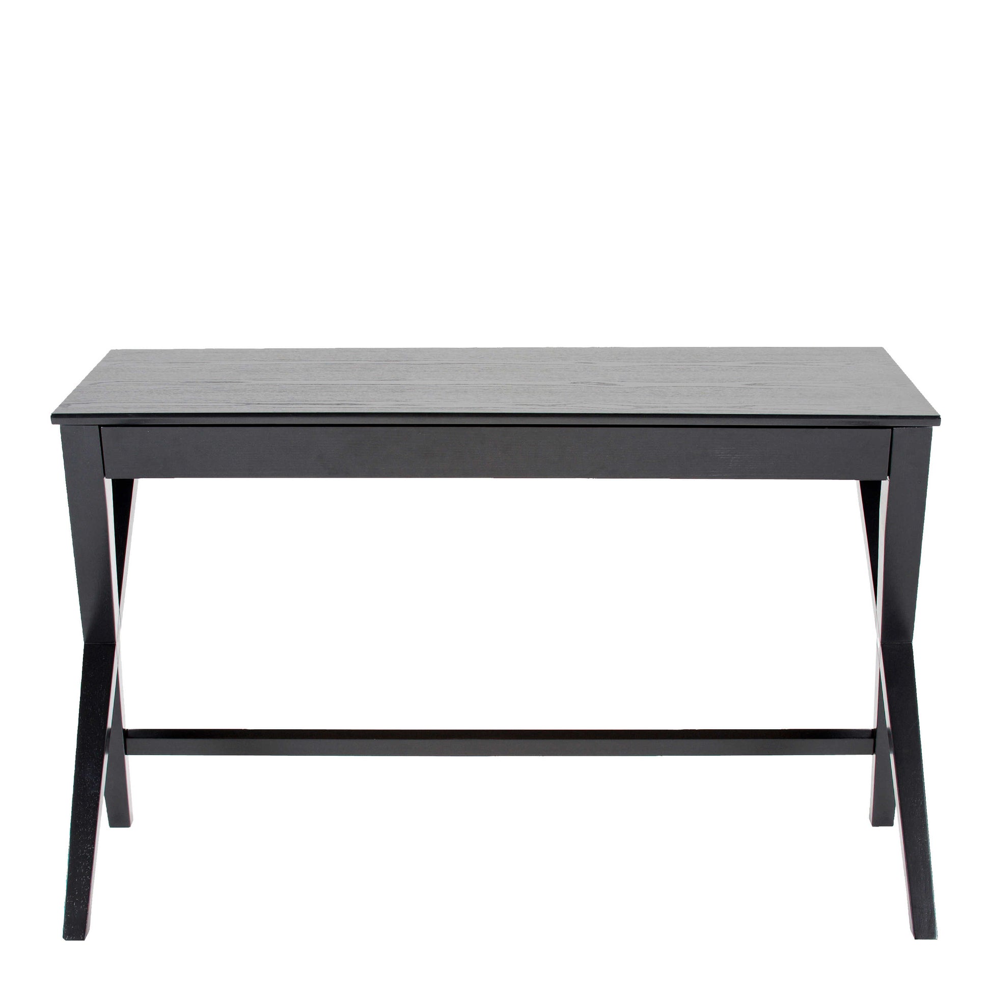 This desk blends a sleek black oak veneer top with a sculptural X shaped rubberwood base, creating a clean and contemporary workspace. The smooth lacquered surface offers a refined look suited to focused tasks, creative sessions or everyday admin, while the integrated wire hole keeps cables neatly managed for a clutter free setup. Its balanced proportions allow it to fit naturally into living rooms, home offices or bedroom study zones.